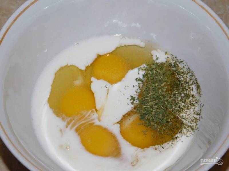 Отдельно перемешайте яйца и молоко. Добавьте соль и специи.