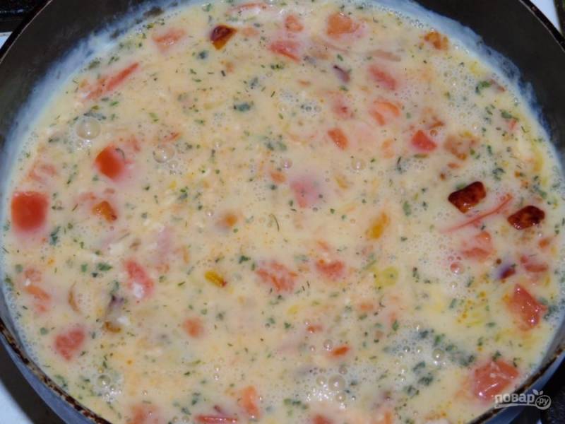 Залейте овощи омлетом и готовьте под крышкой на маленьком огне до готовности, 7-10 минут.