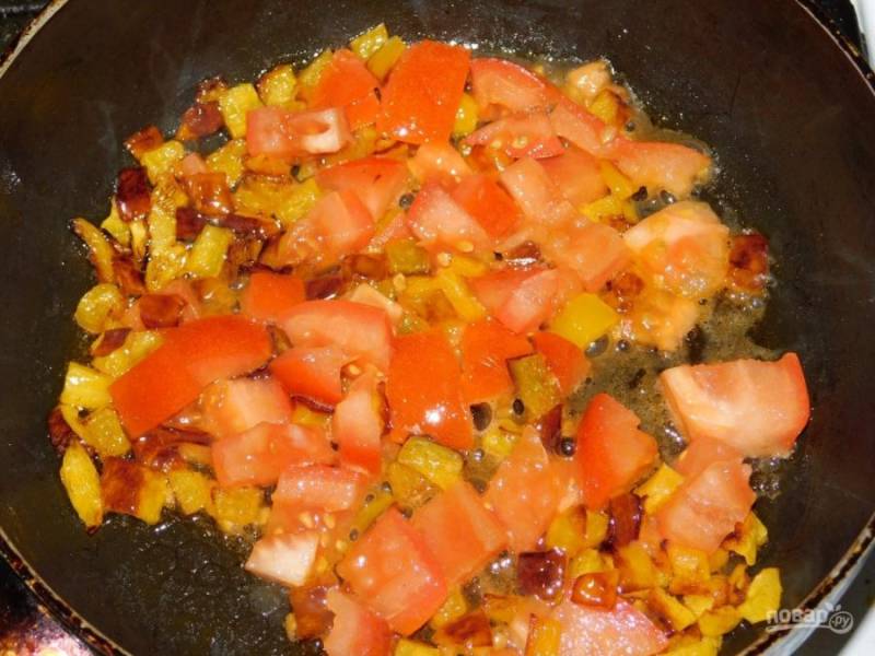 Затем добавьте нарезанные помидоры и обжарьте вместе с перцем в течение 2-3 минут, чтобы помидоры стали мягче и пустили сок.