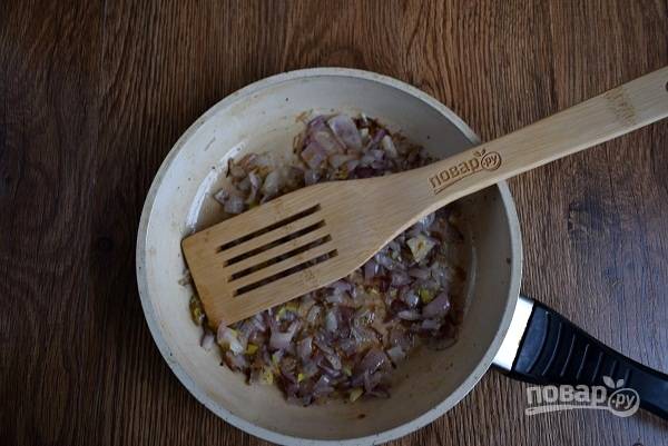 Масло разогрейте на сковороде, добавьте специи и обжарьте порезанный мелко лук до румяности.