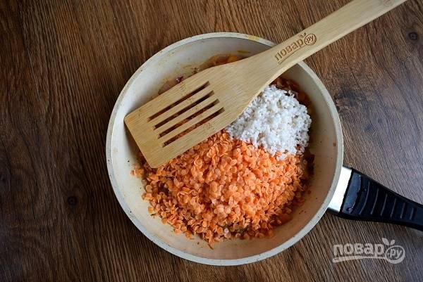 Добавьте чечевицу и рис, обжарьте в течение 5 минут, помешивая.