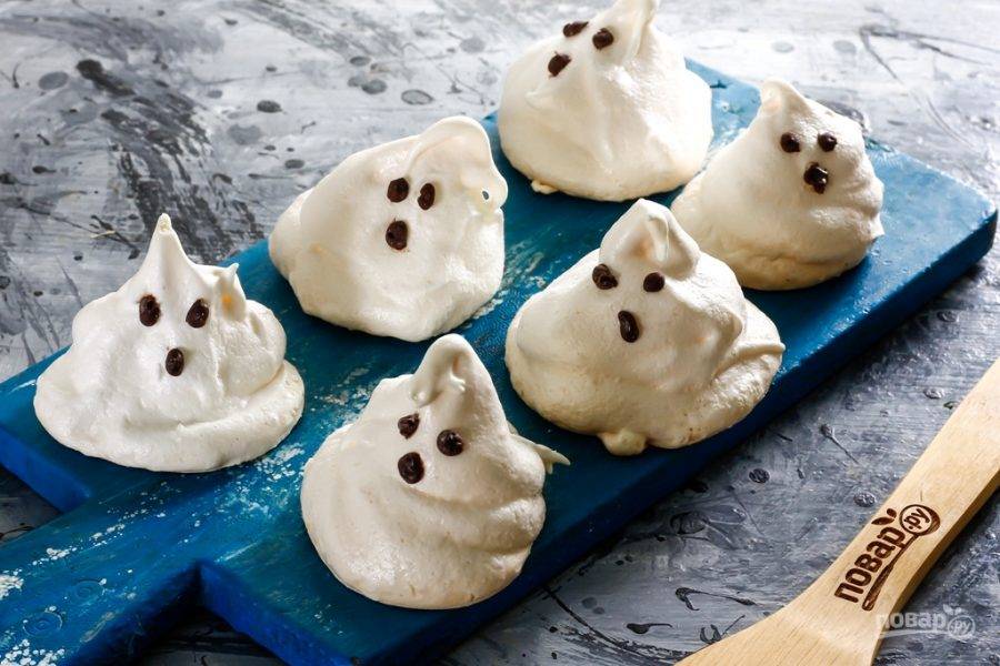 Сладкие привидения-безе на Хэллоуин обязательно понравятся детям, особенно если они сами их будут украшать шоколадом, рисуя глаза и рот. Создать такие фигурки не сложно, главное – высушить их!