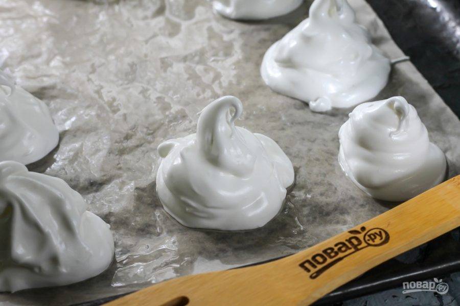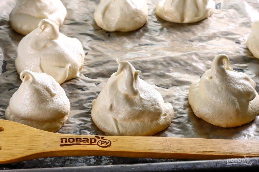 Разогрейте духовку до 60-70 градусов и поместите в нее противень с заготовками, сушите около 3-4 часов, слегка приоткрыв дверцу. Безе должно стать упругим сверху. После этого противень вынесите на холод – безе полностью затвердеет.
