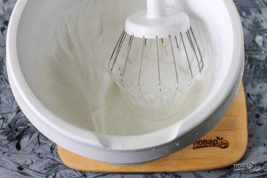 У вас должна получиться пышная белая масса, которая остается на венчике, а не стекает обратно. На это у вас уйдет примерно 4-5 минут, но дольше не взбивайте, так как можете перебить массу и она расслоится.