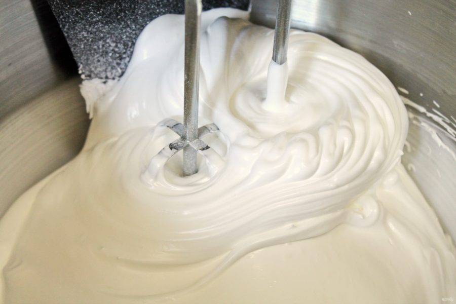Влейте в чашу лимонный сок, увеличьте скорость и добавляя сахарную пудру взбивайте все до пышной, плотной массы, примерно 10 минут.