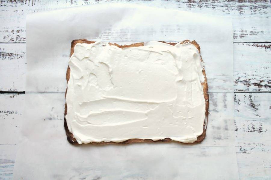 Сливки с сахарной пудрой и ванильным сахаром взбейте в пышную массу и нанесите на корж из меренги.