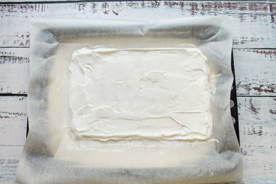 Противень застелите пергаментом и выложите белковую массу, разровняйте в прямоугольник 40 на 35 сантиметров.