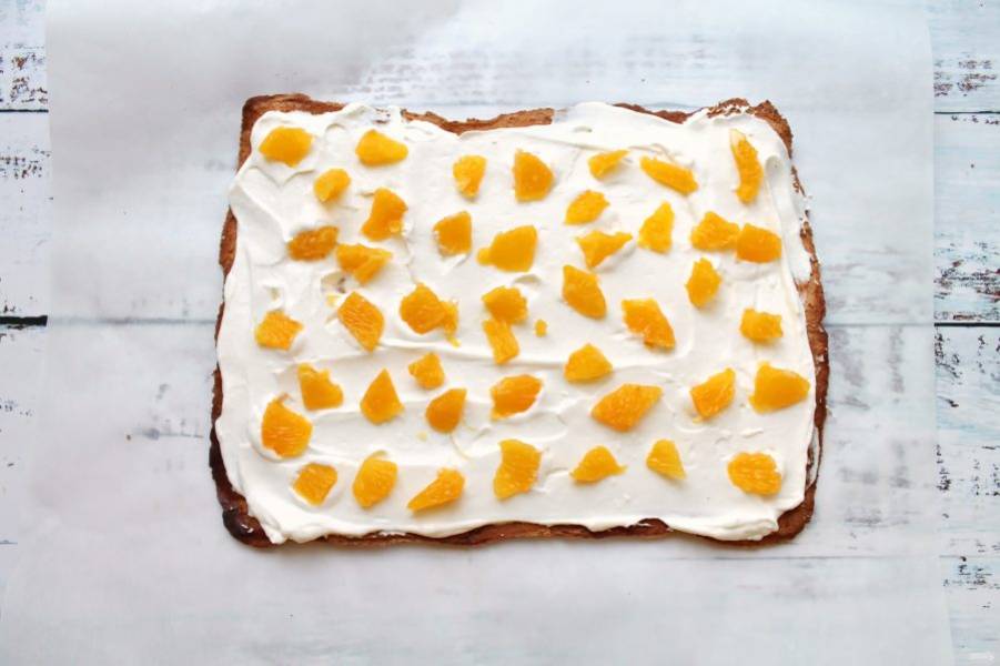 Мандарины очистите от кожуры, разделите на дольки, удалите все перегородки и пленки. Разрежьте их на кусочки и разложите поверх крема.