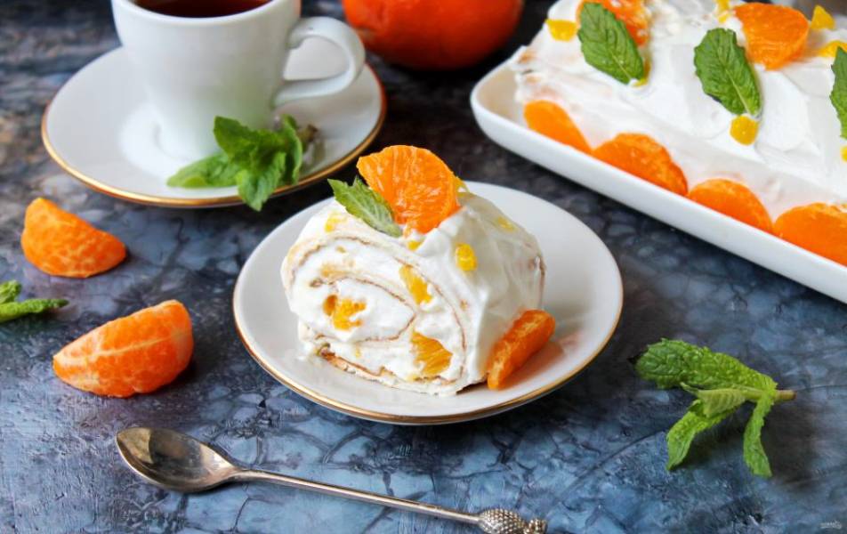 Вкусный, воздушный меренговый рулет будет в радость на любом праздничном столе. А кусочки свежего мандарина придадут ему сочность и легкую кислинку. Берите рецепт на вооружение!