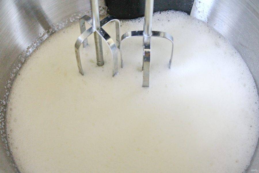 Яичные белки вылейте в чашу миксера, добавьте щепотку соли и взбейте в мягкую пену.