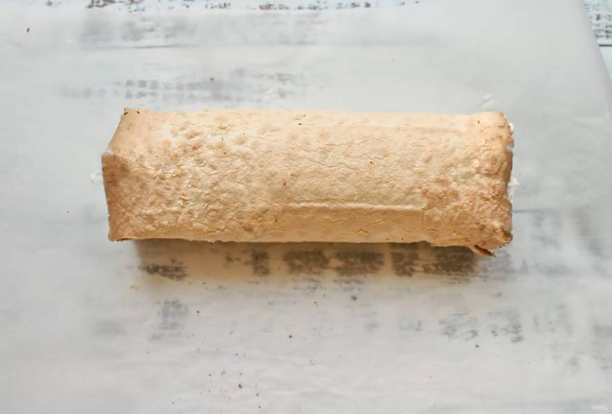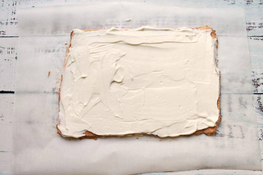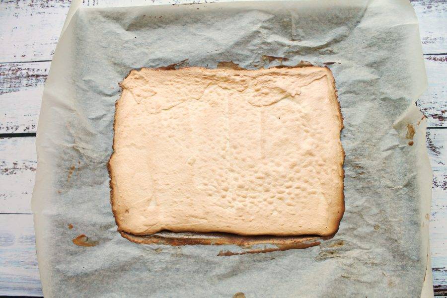Поставьте противень в горячую духовку и выпекайте при температуре 160 градусов в течение 30-35 минут. Готовый корж достаньте из духовки, переверните на чистый пергамент и снимите нижний. Оставьте корж до полного остывания.