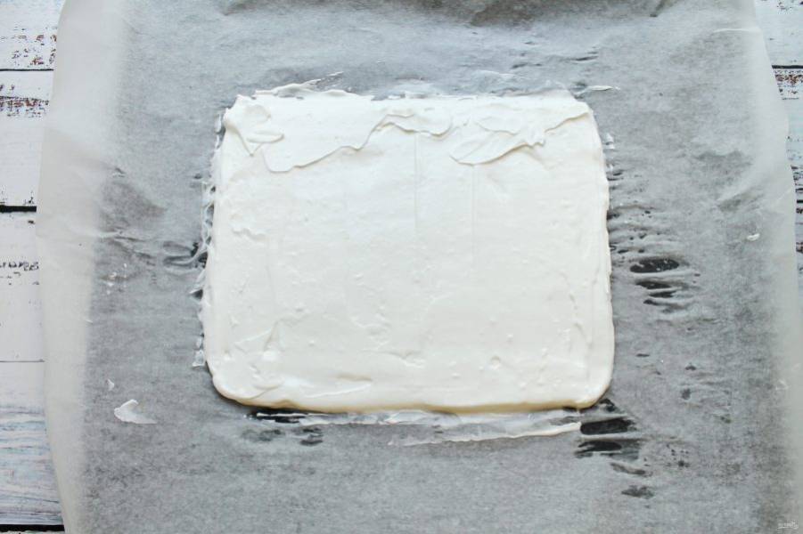Противень застелите пергаментом и выложите меренговое тесто. Разровняйте в прямоугольник 35 на 35 сантиметров.