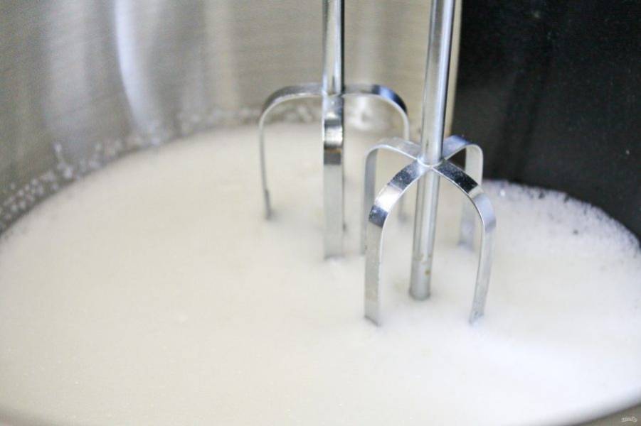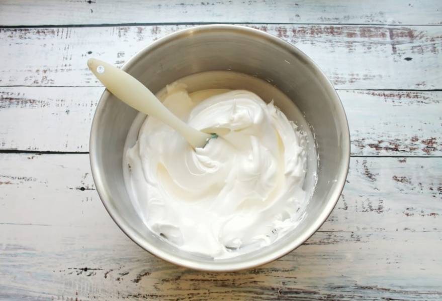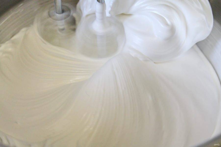 Продолжая взбивать, увеличивая скорость, добавляйте понемногу сахар. Взбивайте все до пышной, стойкой массы и полного растворения сахара. На это уйдет примерно 8-10 минут.