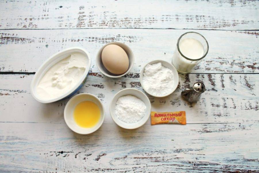 Подготовьте все необходимые ингредиенты для приготовления меренгового рулета с творожным кремом.