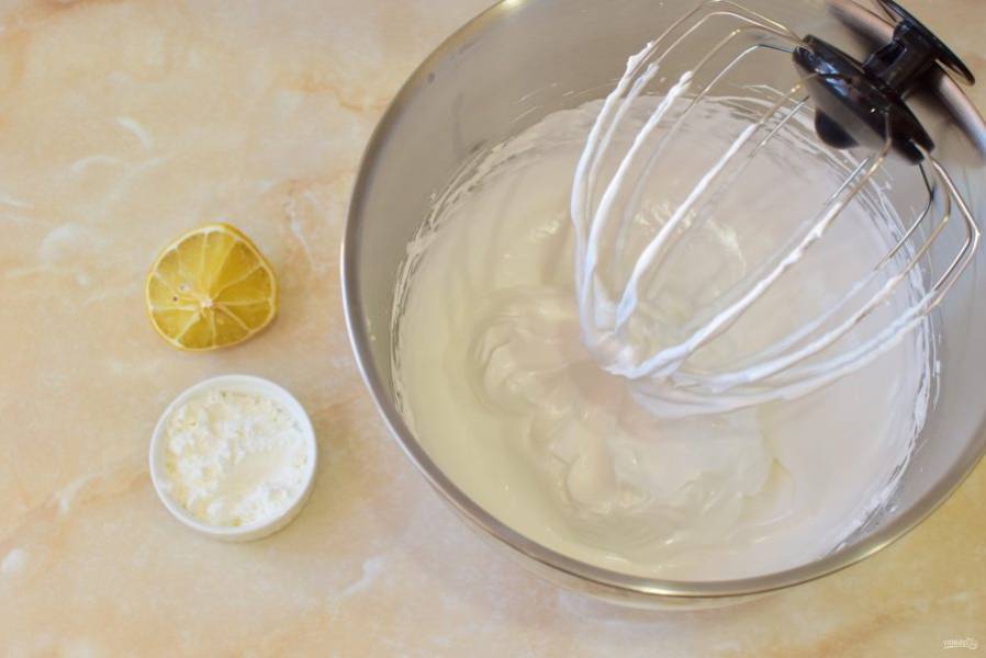 Когда масса станет пышной и густой, вмешайте крахмал и сок лимона.