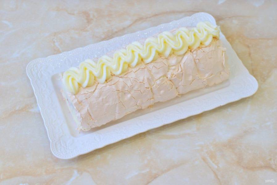 Немного крема отложите в кондитерский мешок для декора. Оставшийся крем распределите по меренге, немного не доходя до краев.
