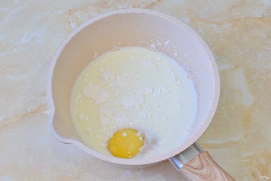 Первым делом необходимо приготовить крем, чтобы он успел остыть. Налейте в ковш молоко. Добавьте яйцо, сахар и крахмал. Все смешайте и поставьте на огонь.