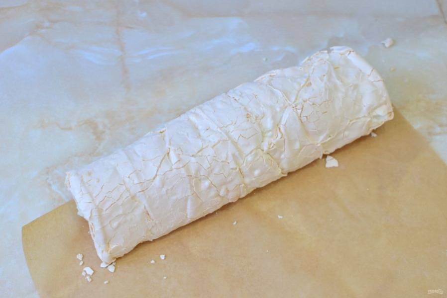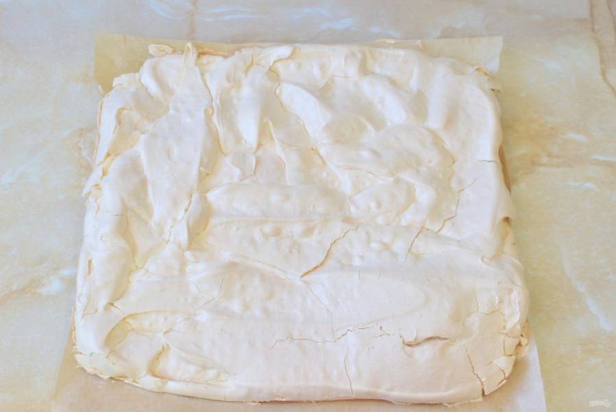 Готовая меренга внутри остается мягкая и воздушная, а снаружи появляется тонкая хрустящая корочка. Извлеките её из духовки и остудите. Затем переверните на лист пергамента, а тефлоновый коврик снимите.