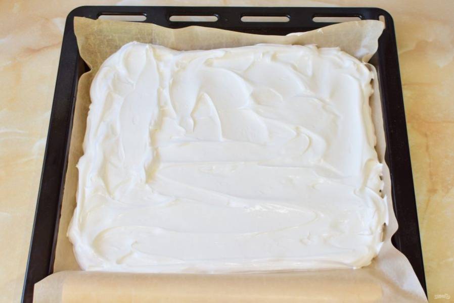 Готовую меренгу распределите по тефлоновому коврику, постеленному на противне (30*40). Поставьте противень в духовку, предварительно разогретую до 140 градусов, примерно, на 25 минут. Ориентируйтесь по своей духовке.