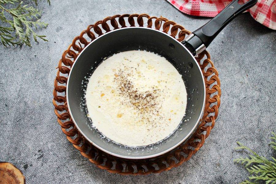Влейте в сковороду сливки, доведите до кипения. Все поперчите, посолите и добавьте измельченный чеснок, снимите с огня.