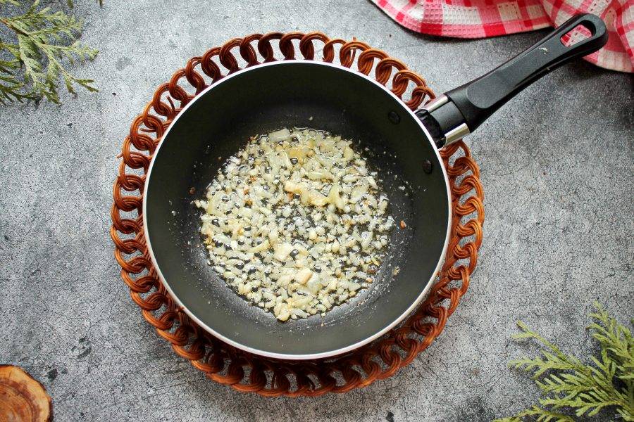 Репчатый лук почистите и мелко порежьте. В сковороде растопите сливочное масло, добавьте растительное масло, лук и обжаривайте на медленном огне все в течение 5-7 минут, до мягкости.
