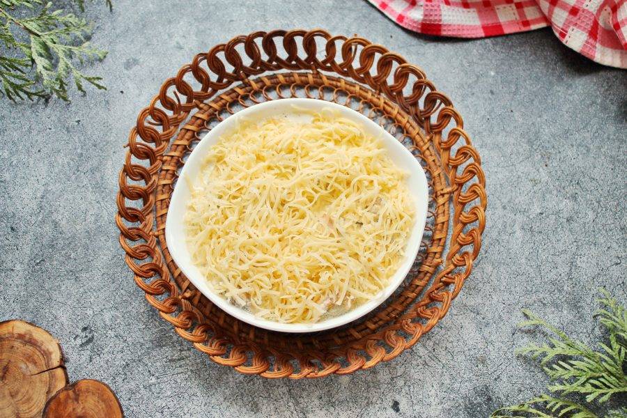 Переложите мидии в сливочном соусе в форму для запекания и посыпьте твердым сыром, натертым на средней терке.