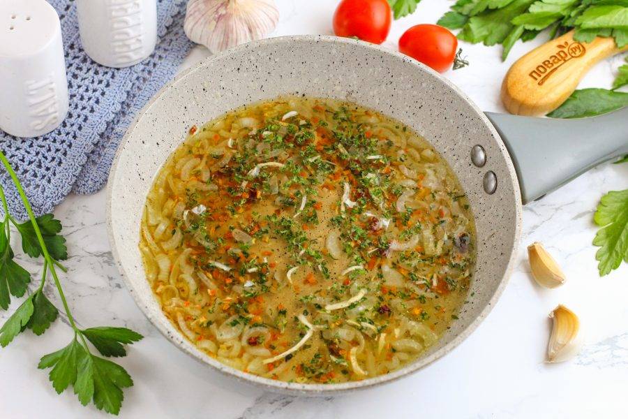 Влейте белое вино и всыпьте соль, молотый черный перец и овощную приправу. Проварите 1-2 минуты до закипания вина.