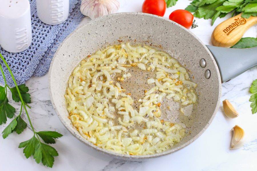 Лук и чеснок очистите от шелухи и промойте в воде. Нарежьте луковицы мелким кубиком или полукольцами и отпассеруйте в сливочном масле на сковороде примерно 3-5 минут до румяности.