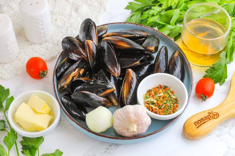 Подготовьте указанные ингредиенты. Приобретите мидии в раковинах и проследите за тем, чтобы раковины были закрыты.