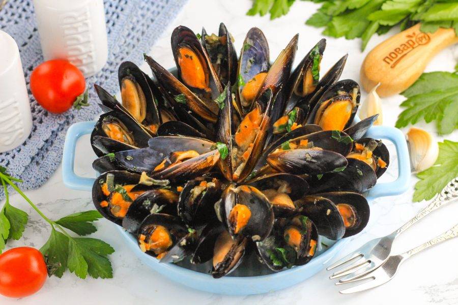 Выложите аппетитные мидии "Мариньер" на тарелки или на блюдо и подайте к столу горячими.