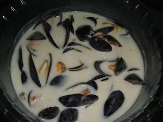 В бульон добавить сливки, растворенный в воде крахмал, специи. Довести до кипения. Бульон должен слегка загустеть. Опустите в соус часть мидий.