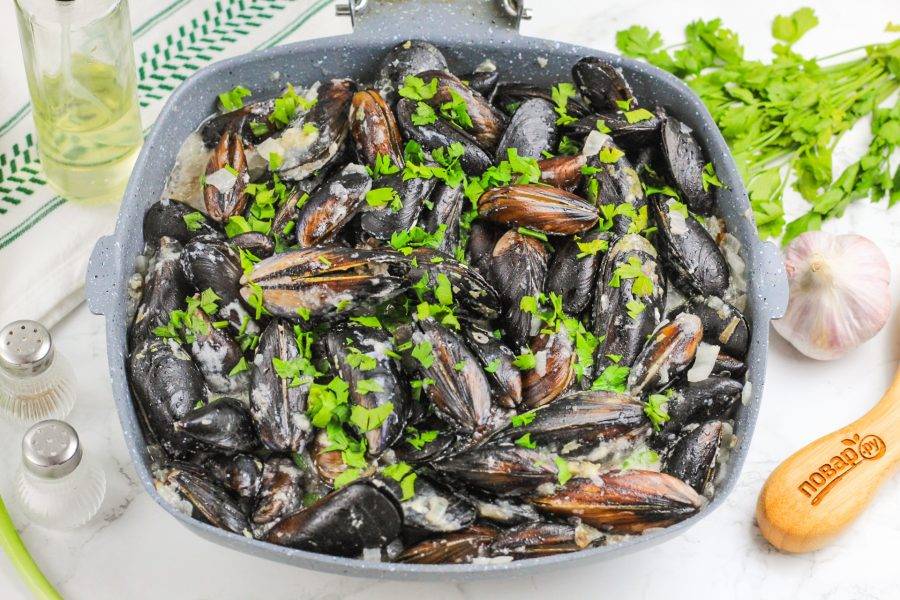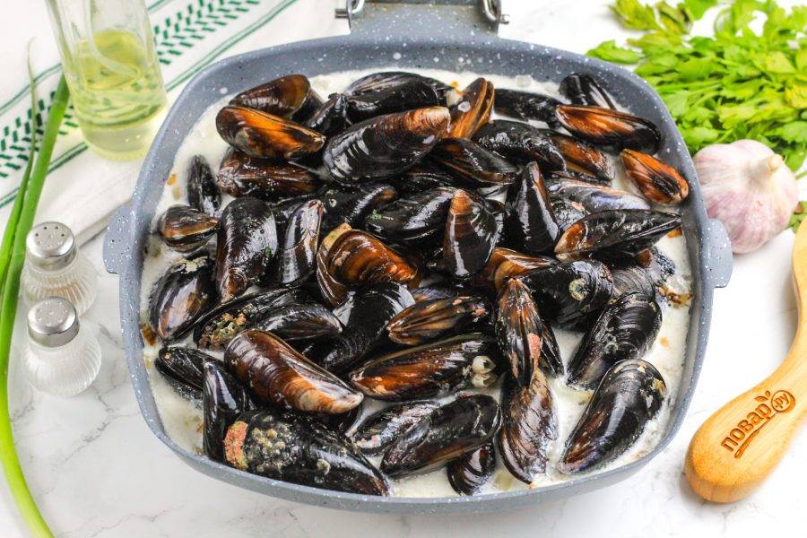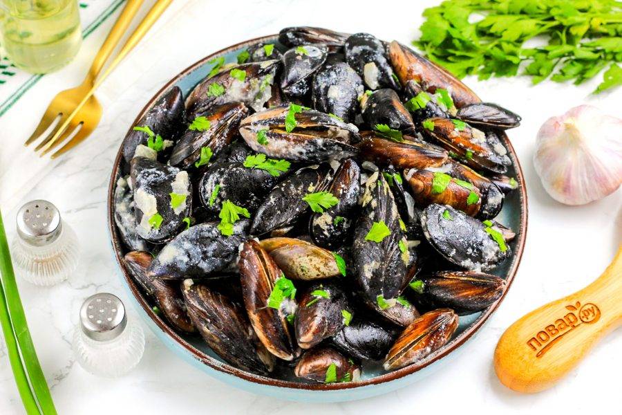 Выложите мидии в белом соусе на тарелку и подайте к столу горячими. Приятного вам аппетита!
