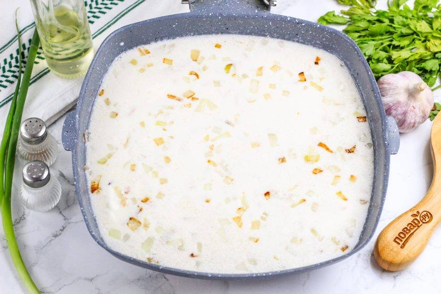 Выложите сметану любой жирности и влейте горячую воду. Посолите и аккуратно все перемешайте. Доведите соус до кипения на умеренном нагреве. Если используете 10% или 20% сливки, то воду не добавляйте. Сливок должно быть около 150 мл.