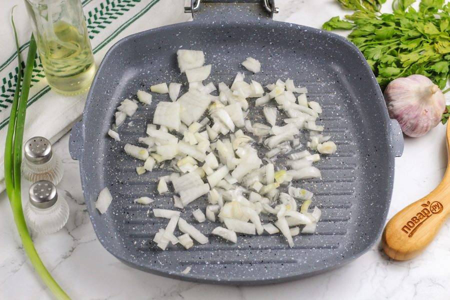Нарежьте лук мелкими кубиками, а чеснок измельчите. Прогрейте на сковороде с высокими бортиками растительное масло и всыпьте нарезки. Прожарьте примерно 3-4 минуты.