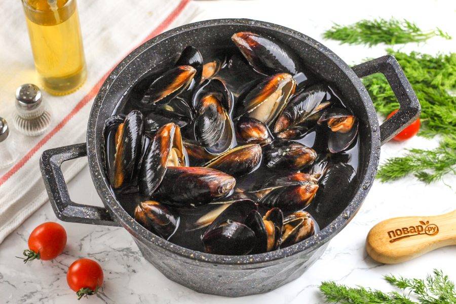 Мидии тщательно промойте, удалите поврежденные раковины и выложите их в казан или кастрюлю. Залейте горячей водой и всыпьте 1-2 щепотки соли. Отварите с момента закипания 3-4 минуты в зависимости от величины мидий.