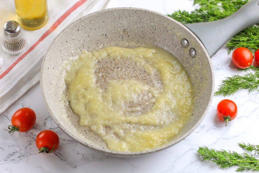 Растопите в сковороде сливочное масло и всыпьте муку. Венчиком или лопаткой тщательно перемешайте и поджарьте примерно 1-2 минуты до румяности массы.