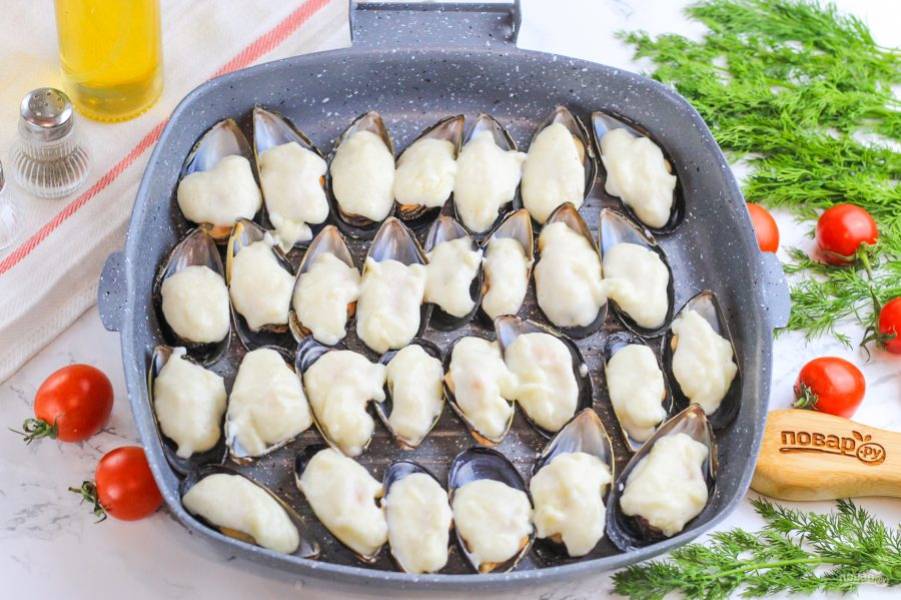 Запеките 5-6 минут до румяности сырной корочки. Помните, что мидии уже отварены.