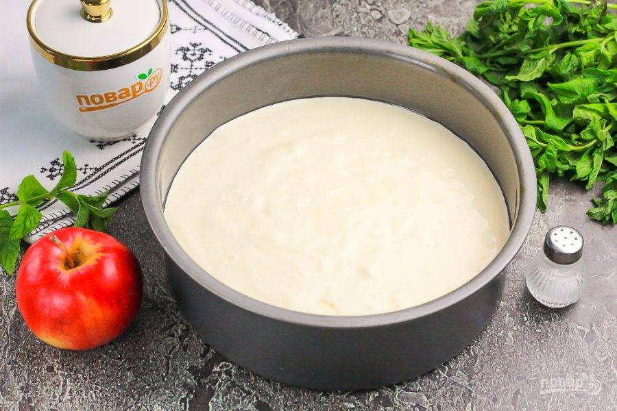 Смажьте форму для выпекания растительным или сливочным маслом, выложите в нее приготовленное тесто. Разогрейте духовку до 180 градусов.
