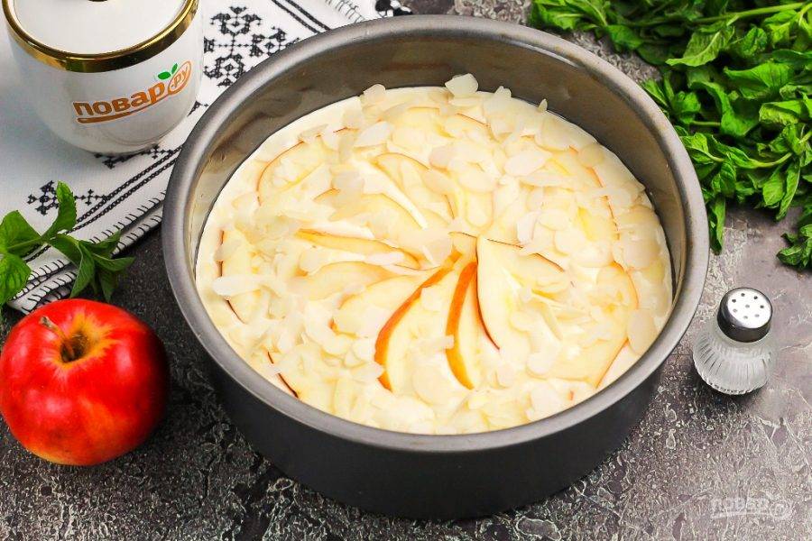 Присыпьте заготовку миндальными лепестками по всей поверхности и отправьте форму в духовку на средний уровень. Во время выпекания не открывайте дверь техники, чтобы пирог не опал из-за разницы температур.
