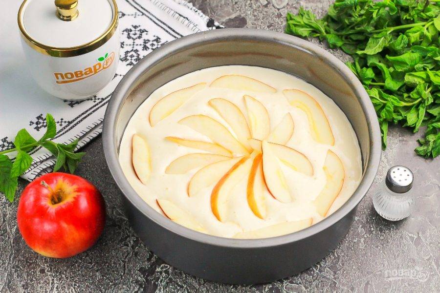 Яблочную нарезку выложите сверху — тесто будет подниматься и слегка "утопит" нарезку. Можно выложить яблоки на середину или по всей поверхности — как вам будет угодно!