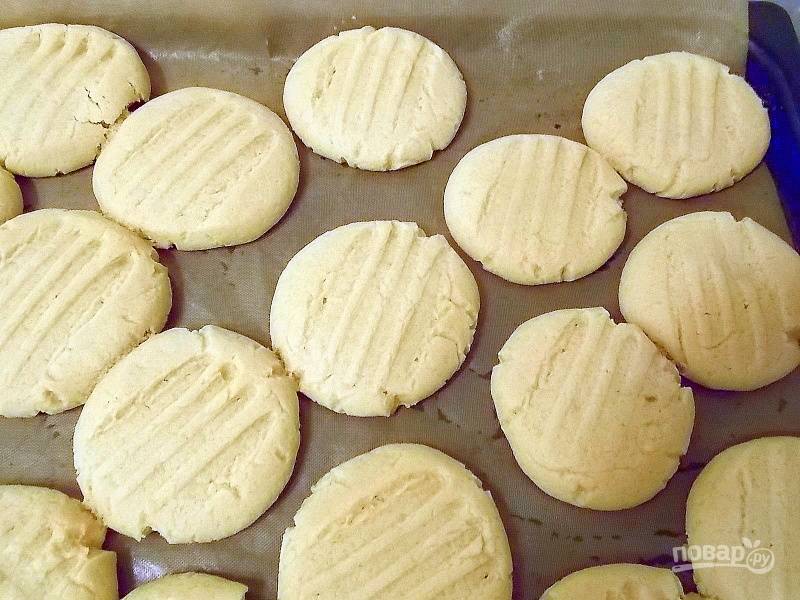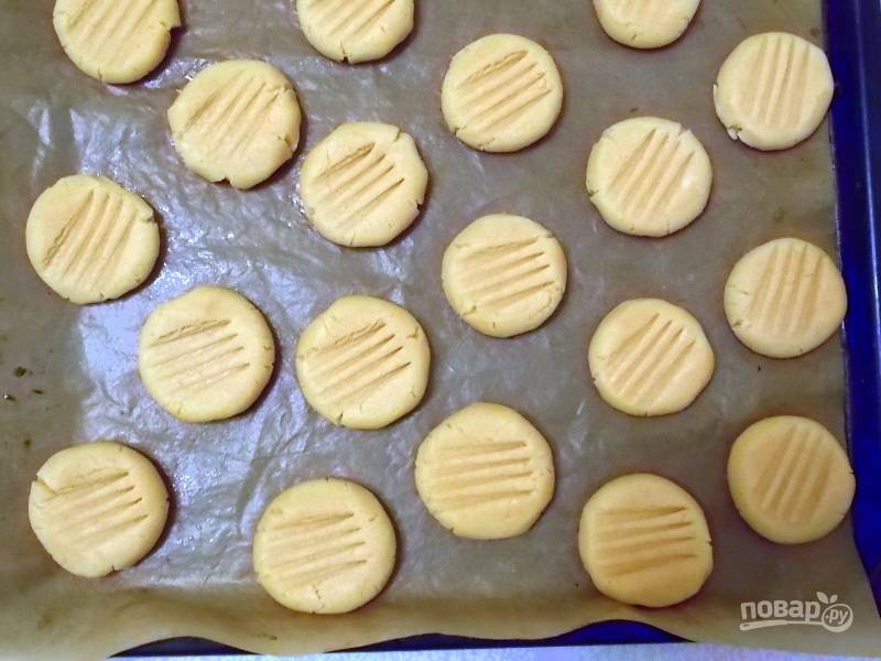 Скатайте из массы 10 шариков, уложите на смазанный маслом противень. Придавите верх вилкой.