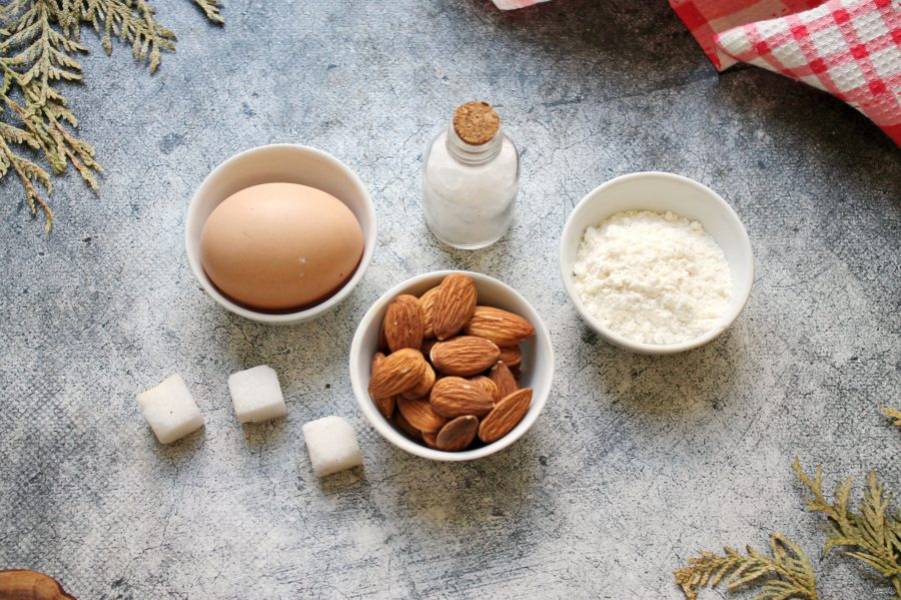 Подготовьте все необходимые ингредиенты для приготовления миндального печенья. Яйца разделите на белки и желтки, желтки нам не понадобятся.