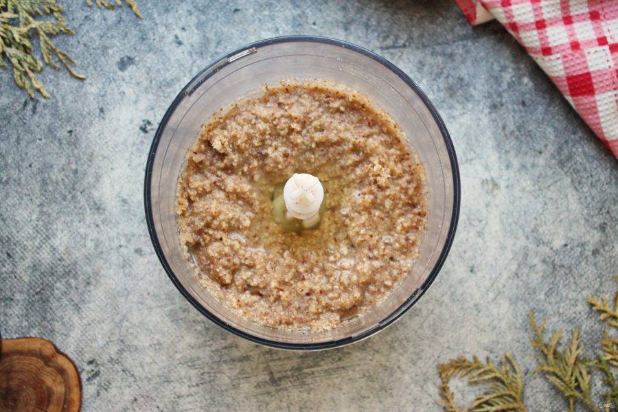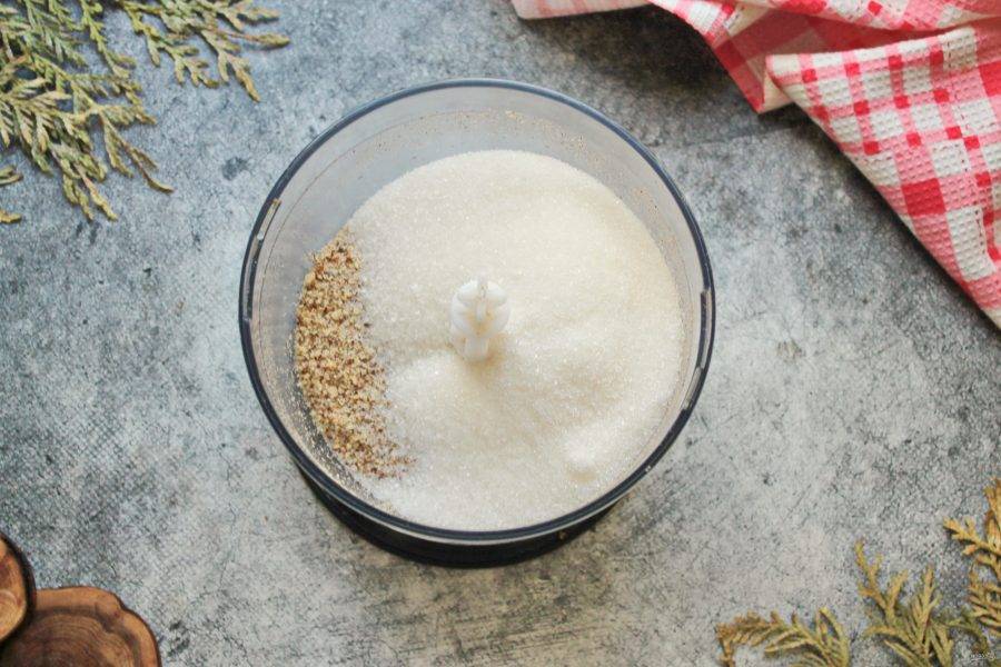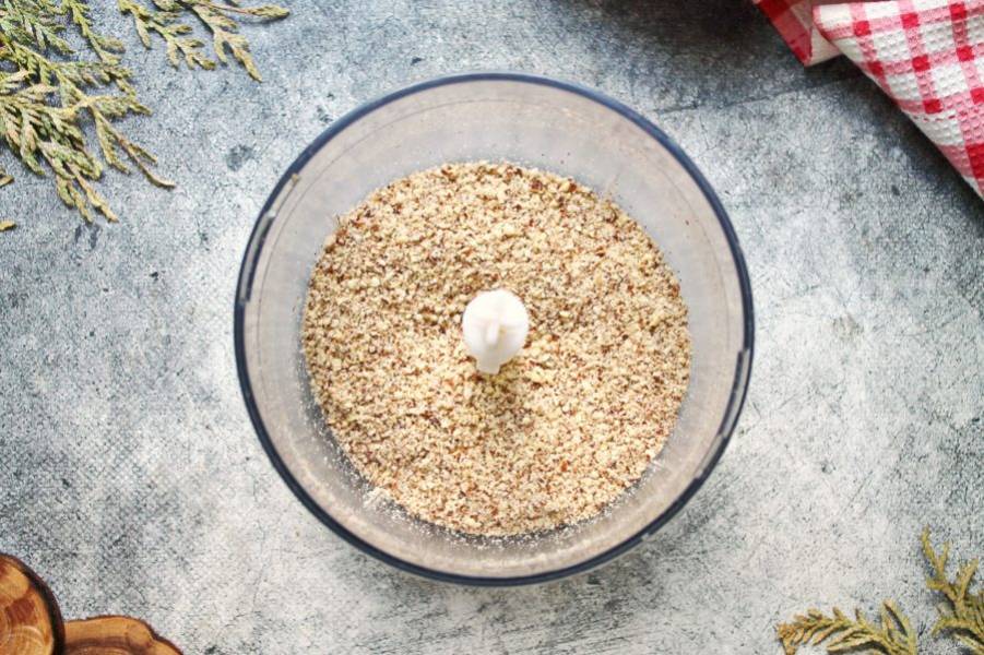 Жареный миндаль измельчите в мелкую крупку, но не перестарайтесь, иначе выделится масло.