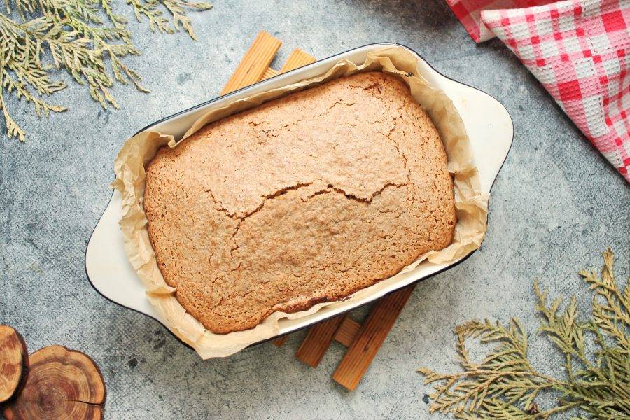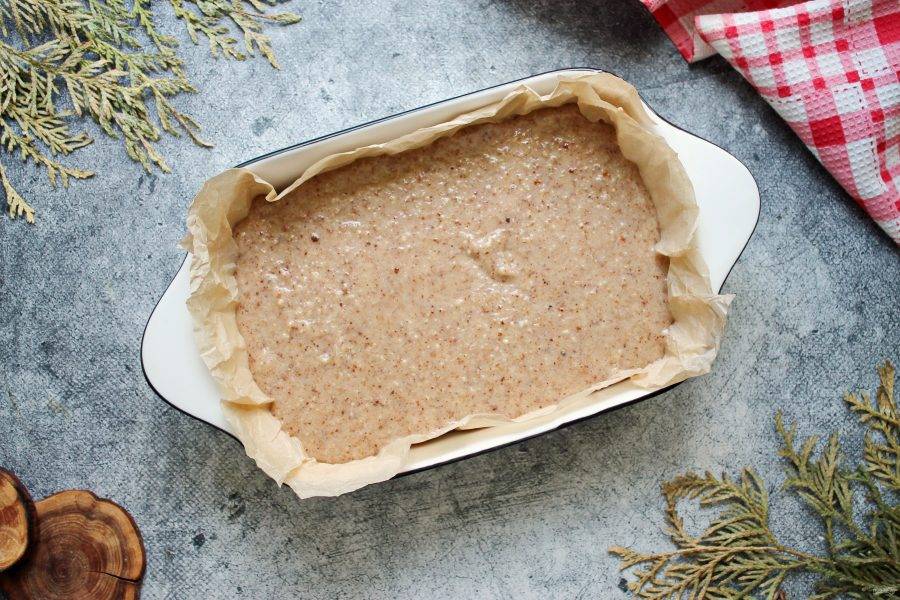 Форму для запекания размером 20 на 15 сантиметров застелите пергаментом и смажьте его растительным маслом. Переложите в форму тесто и разровняйте.