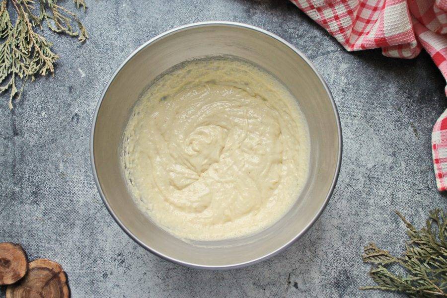 Все перемешайте, а затем взбейте на средних оборотах до пышной, светлой массы. Тесто должно быть как бисквитное.