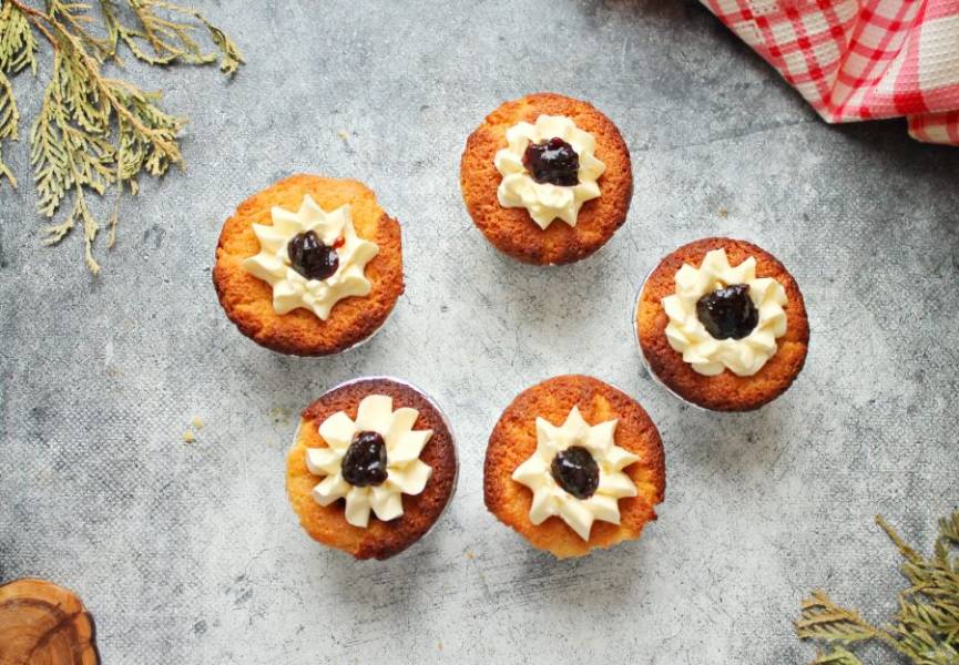 Переложите крем в кулинарный мешок с насадкой и сделайте сверху шапочку. При желании выложите немного джема сверху.