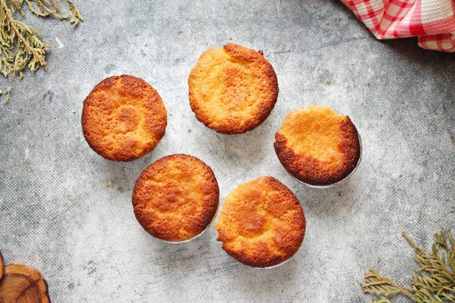 Установите формочки на противень или если формочки не усиленные, поставьте внутрь ячеек формы для кексов. Поставьте в горячую духовку и выпекайте при температуре 180 градусов в течение 25-35 минут, до готовности, которую можно определить при помощи деревянной шпажки. Готовые капкейки достаньте из духовки и полностью остудите.