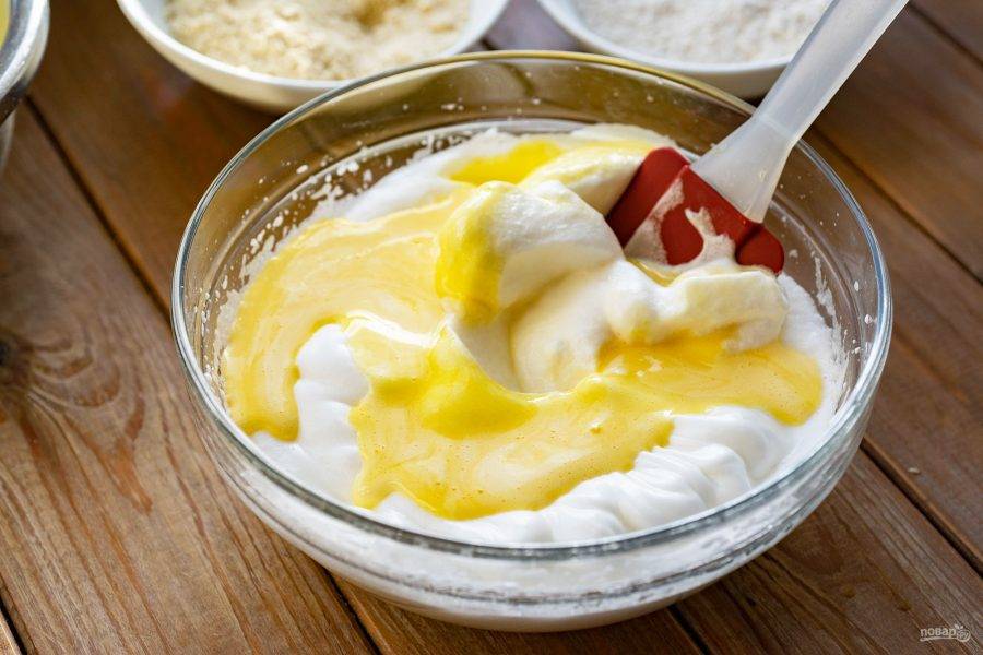 Желтковую массу добавьте к белковой и силиконовой лопаткой вмешайте желтки в белки до получения равномерной, воздушной массы.