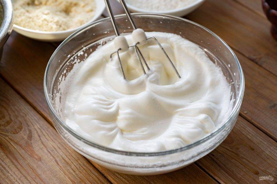 Белки выложите в другую чистую и сухую миску, добавьте к ним щепотку соли. Миксером взбивайте белки и по ходу процесса добавляйте маленькими порциями оставшиеся 40 грамм сахара. В итоге у вас должна получиться устойчивая белковая масса, которая при переворачивании миски вверх дном остается неподвижной.