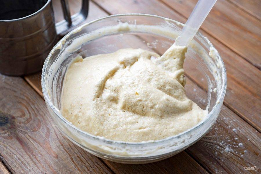 Следом просейте всю пшеничную муку и также аккуратно вмешайте ее.